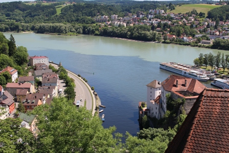 Sun glorious sun! After cool, overcast skies at home in Ottawa, Paris, and even Munich, the warmth we found in Passau was more than welcome, and there was more promised in the coming week. The train left at 10:24AM, precisely on time. This was Germany, after all. It was the Friday before a long weekend. The second class car was almost full. There were even a few bicycles in one open section where you can leave luggage or your own bikes. A few younger people had large back packs ready for a hiking weekend or further travelling. We sat in comfort in our 2nd class seats and I spent the time completing write ups of our trip so far. We arrived in Passau on time and found a taxi to take us to our hotel across the river from the old town. We checked into a comfortable room with a small balcony in the Innsento Hotel and left immediately to find a lunch spot as it was now after 1 PM. A garden restaurant owned by Innstadt brewery, established nearly 700 years ago, fit the bill. The atmosphere and food was so good we returned to the hotel for dinner the next two nights with Marg and Jack Dunphy, who had arrived in Passau the day before us. Sufficiently rejuvenated by lunch we set out to explore the old town on the other side of the river. Passau was established in the 13th century on a peninsula at the confluence of 3 rivers, which established Passau as a transportation hub for many centuries, with salt being the most lucrative product. The Danube, which looked more greenish-blue than the advertised blue to us, originates in the Black Forest of Germany and runs through Austria, Hungary, Serbia, Slovakia, Croatia, Bulgaria, Moldova, Romania and the Ukraine to empty into the Black Sea. It is the second longest river on the European Continent, after the Volga. The Inn River’s waters are a definite green from glacial melt starting in the Swiss Alps. The third and smallest river is the Ilz, AKA “the black pearl”, originates in Bavarian mountains. The river is named for the dark colour of the water and the existence of rare fresh water mussels that produce a pearl. Most of the land bordering the Ilz is protected park land to preserve its environment. It was amazing to actually see the different colours of the waters from the three rivers converge from a park at the eastern end of the peninsula and from a view point high above the city on the northern shore. It even showed up on our photos. Number one on everyone’s list of places to visit