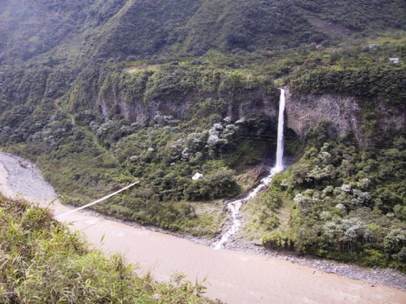 The path started in a cleft in the soft sandstone sides of the volcano. It was well marked and not very difficult. One long section was fun to go down. The sandstone had crumbled into a sand dune that you could dig your heels into and bounce down. Near the lakeshore we passed flocks of sheep being herded by locals. A few llamas and cows were also grazing on the sparse vegetation of the hillside. We reached the shore in just over a half hour and dabbled our hands in the water to discover it wasn't very cold. We had passed two Dutch girls riding up on mules and learned later that they had gone swimming in the lake, but we had not thought to bring our suits. We were hungry for some lunch so after looking around and taking pictures, we started the uphill climb. That is when we realized we were at 3500 M and the path was steep. That sand dune that was such fun to run down was murder going up. Your feet sink in and slip back with each step. We had lots of rest stops along the way to have a drink of water and catch our breaths. I started thinking wistfully about those mules, although I do not like riding. We persevered though and made it to the top in under an hour. Ramiro was impressed. He said most people take 1 1/2 to 2 hours for the return trip, so I guess we were not as bad as we thought. We were glad to tuck into the food Ramiro had brought for us. Refreshed, we headed home, awing again at the mountain scenery as we bounced along the rough road back to town. From Latacunga we went just a little farther south to Baņos. It is a pretty little town in a narrow valley in the middle of the Andes. Since it is only 1800 M high, the steep hills are lush and green. Baņos is known for its thermal baths, but we haven't taken advantage of them yet. Instead, we have been biking and hiking. The first day we rented mountain bikes to follow the Route of the Waterfalls. It was supposed to be 60 Km "mostly downhill" from Baņos to Puyo, due east. We started out straight downhill, as advertised on a nice paved road beside a river through a narrow canyon. Just the kind of riding I like. We stopped to admire the many waterfalls which shot down off the steep mountain sides to the river below.