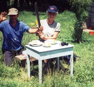 At about the 8 Km mark we had to go through a short tunnel. Thank goodness there was no traffic and we could see light from the exit, because there was no other lighting. Another tunnel loomed before us but it had a notice saying "no bicycles". There was a bike detour on the old road next to the river. It was great. By this time we were at least 100 M above the river and we had a great view, plus we didn't have to worry about that tunnel. The downside was that the paved road ended after the tunnel. It was a rough ride for the next 20 Km but that is why we had mountain bikes. We had a few uphills that let us realize that this ride was not a piece of cake. We were glad to take a break at the 20 Km mark. There was a big sign pointing to a path down towards the river, promising a waterfall viewpoint. The 1 Km walk down was steep but easy and the waterfall was spectacular. However, steep down means steep uphill so we paid for the easy descent. Back on the bikes we passed the last of the waterfalls. The valley from then on gradually got a bit broader and Halleluia, we got a paved road again for the last half. We also got an unscheduled break to sit out a downpour. I think this is a regular occurrence in the mountains. It looked like it was clearing so we pushed on. We passed one young couple on one of the unadvertised uphills where the girl had to get off and walk up the hill. I think they turned back before finishing as we never saw them again. The second half of the route is known for the wild orchids growing beside the road and for a large tea plantation that we stopped to admire. The vegetation was pure tropical, different from the barren mountains of the higher altitudes. We made it all the way to Puyo, right to the bus terminal. We were able to put our bikes on top of a bus and travel in relative luxury back to Baņos. It was fun seeing the road over again, although both of us thought it was scarier in the bus. you don't realize how narrow the road is when you are on a bike. There were sections that were only wide enough for one vehicle. We even had to back up once to let a bus travelling the opposite direction pass us. We arrived back in Baņos tired but very pleased with our day. Today we put on our daypacks, bought a sandwich and set out up a trail on the south side of town. They don't believe in easy switchbacks around here. Straight up is shorter but harder. Our first goal was a Mirador (look out), complete with lit up cross, about 300 M above town. We found out you can take a taxi ride all the way up if you don't like walking, but of course we walked. It was a good view, both east and west out of the valley, but the highest peaks were still covered in clouds. We wanted to see the Volcan Tongurahua. That meant we would walk farther up the mountain side. We walked part way on a cobblestoned road that led into a beautiful little resort, Luna Runtun. A local stopped us and asked where we were headed. He advised us to follow a path through the woods that would lead to a great Mirador of the Volcano. We took his advice and chugged up more steep paths until more than an hour later we found ourselves on a ridge with almost a 360 view of the mountains and valleys. Just the spot for lunch.