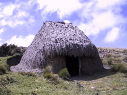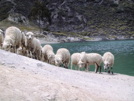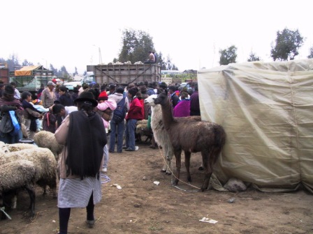 It was a long but rewarding day. Our guide, Ramiro, picked us up in his 4WD vehicle at 7:30 AM on Thursday and off we went to Saquisili. We could tell we were getting close as the road was crowded with farm trucks and other vehicles. This is not a tourist market. Every Thursday people from farms and small villages in the surrounding mountains come to Saquisili to trade animals and goods. The small town is given over to many different markets. We visited three main areas. The first one was the animal market. I am sure that Ray's father would have felt right at home, except there was not an auction. Instead, the farmers unload their livestock from the back of their truck and tether them to a spot on the ground. Then prospective buyers wander about comparing the animals and finally making their purchases. There were lots of Holstein cows, sheep and pigs for sale, as well as some Llamas, goats, donkeys and mules. From the animal market, Ramiro took us to another area where fruit, vegetables, fish and meat were sold. There were a few booths offering rugs and other tourist souvenirs, but that was not the main purpose. The locals far outnumbered the few tourists there. My only disappointment was that unlike Otavalo, there were very few people in traditional dress, except for the fedora. Everyone seems to have embraced the more contemporary look. The third market area we visited had more fruits and vegetables, but it also had a section offering live poultry, rabbits and even guinea pigs. We have yet to sample the Ecuadorian delicacy of cuy (guinea pig). One thing that puts us off is the presentation. It is usually served whole with the head and little paws still on. After we had had our fill of the markets, Ramiro drove us through the hills to Lago Quilotoa. The route was spectacular, winding past ever changing vegetation until we reached the altiplano at 4000 M. We passed reforested areas of eucalyptus and pines, green cultivated fields, sheep pastures and finally grasslands, the home of the llama. A bit further we stopped to look down into deep sandstone canyons, formed by rivers, which were dry at this time of year. In one of the highest areas the local people build their homes from the long grasses that grow in tufts over the hills. We stopped to look inside one of the straw huts that was empty at this time. An open doorway opened into one small windowless room with a dirt floor. Ramiro assured us it was very snug and comfortable but I like a little more comfort.